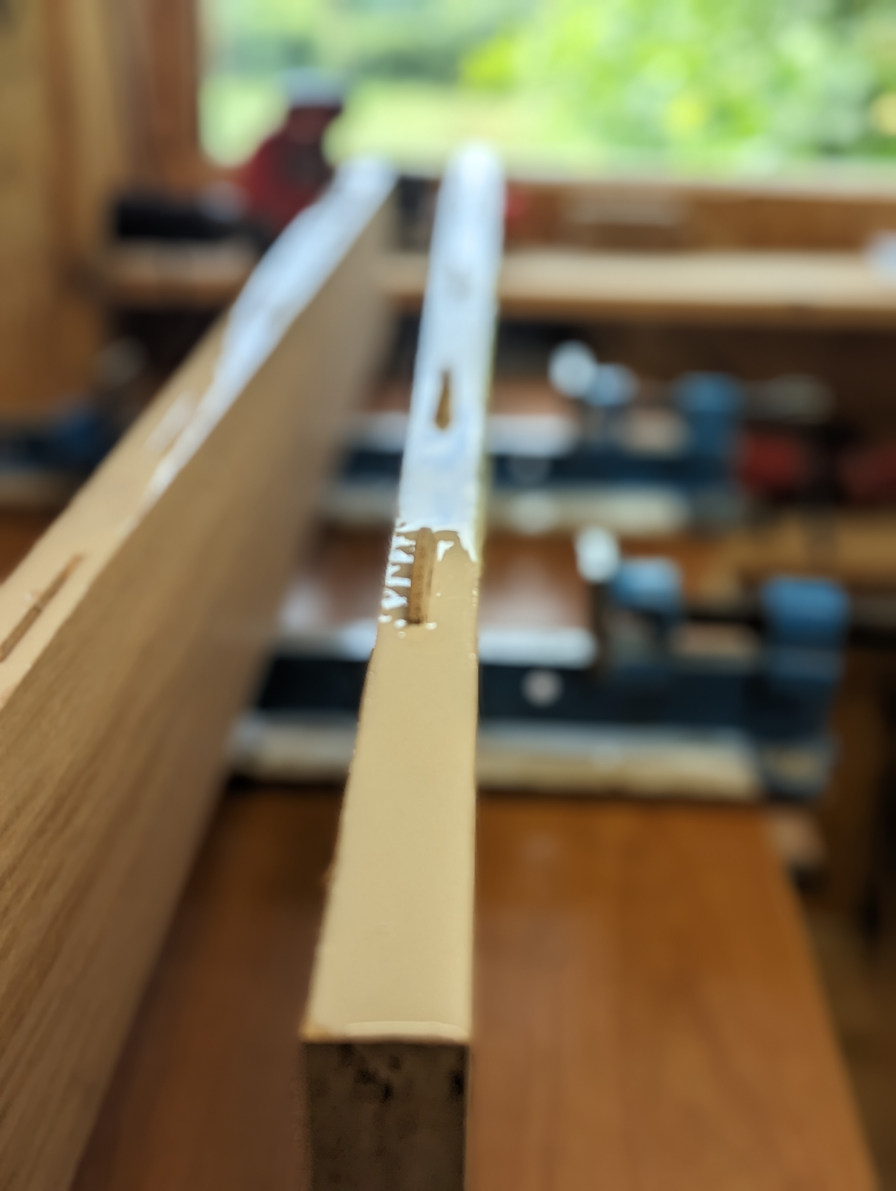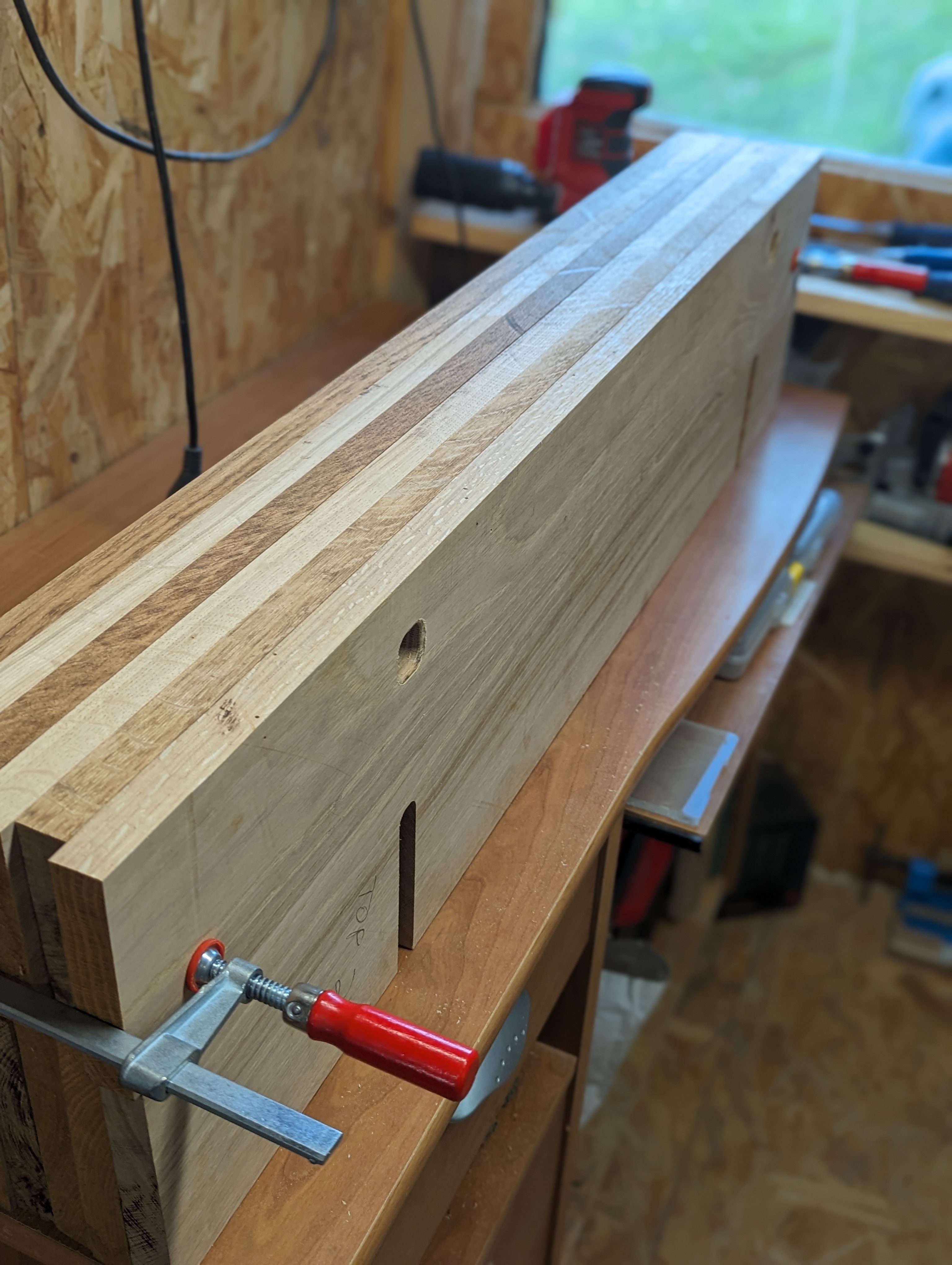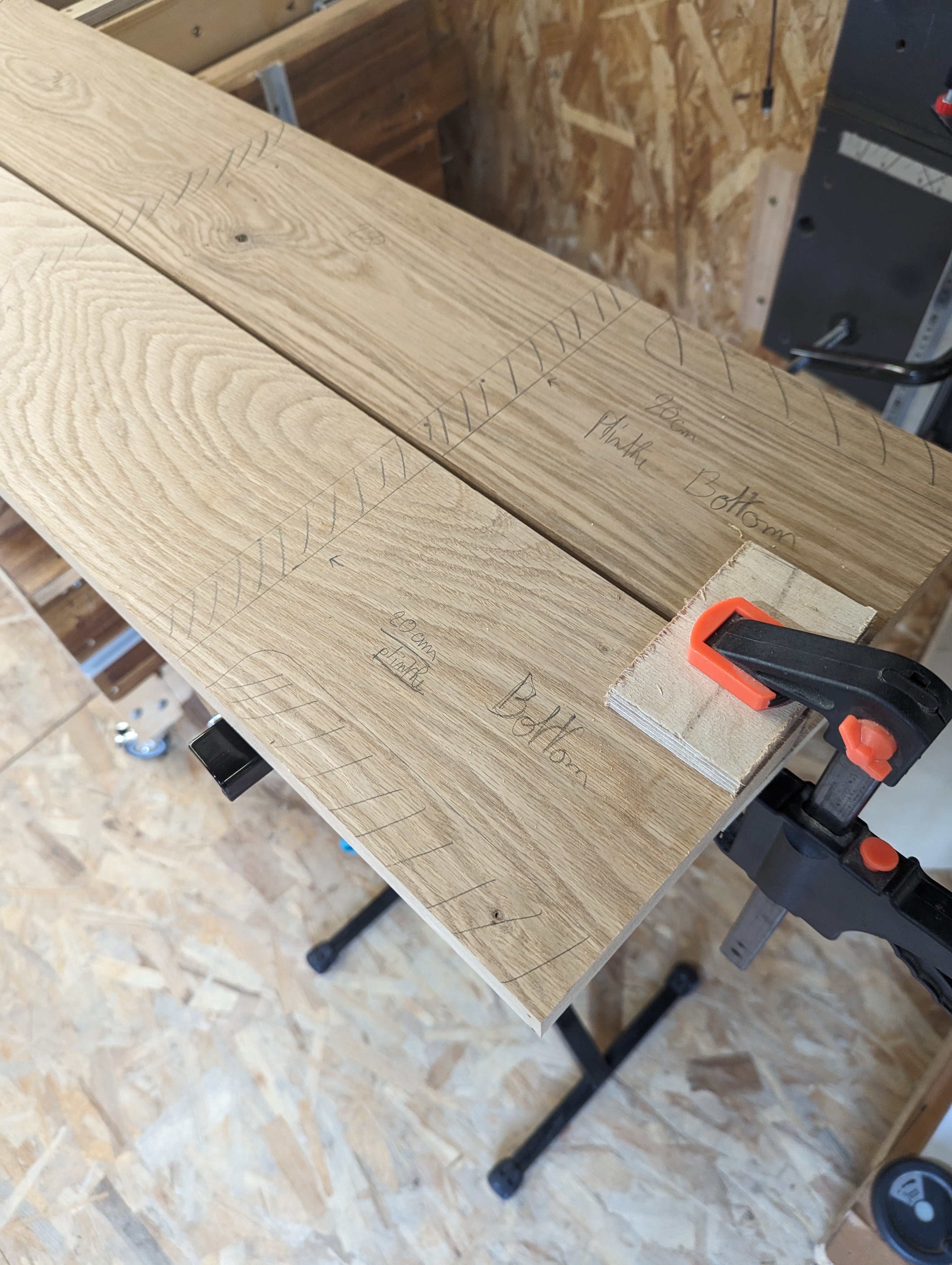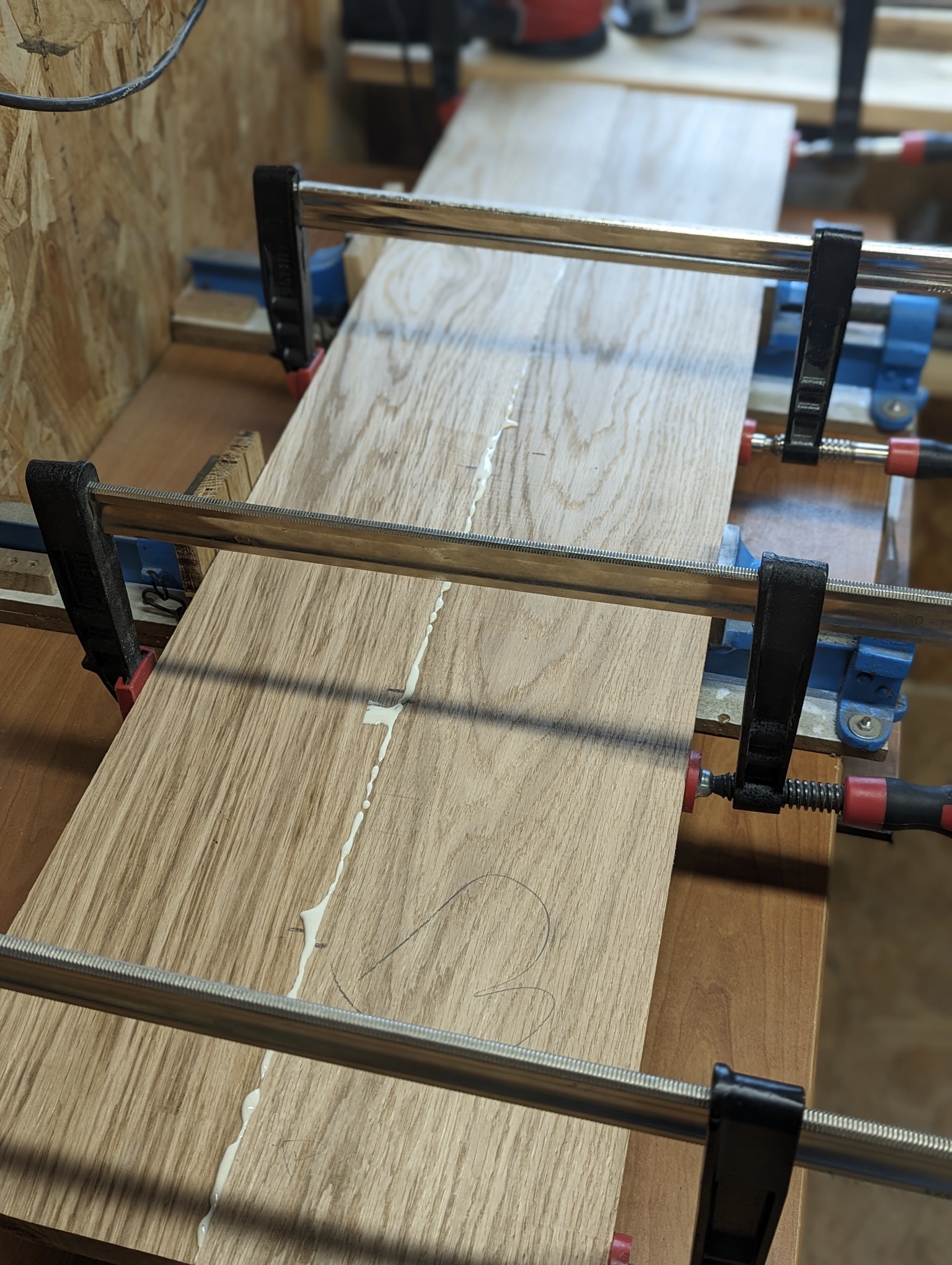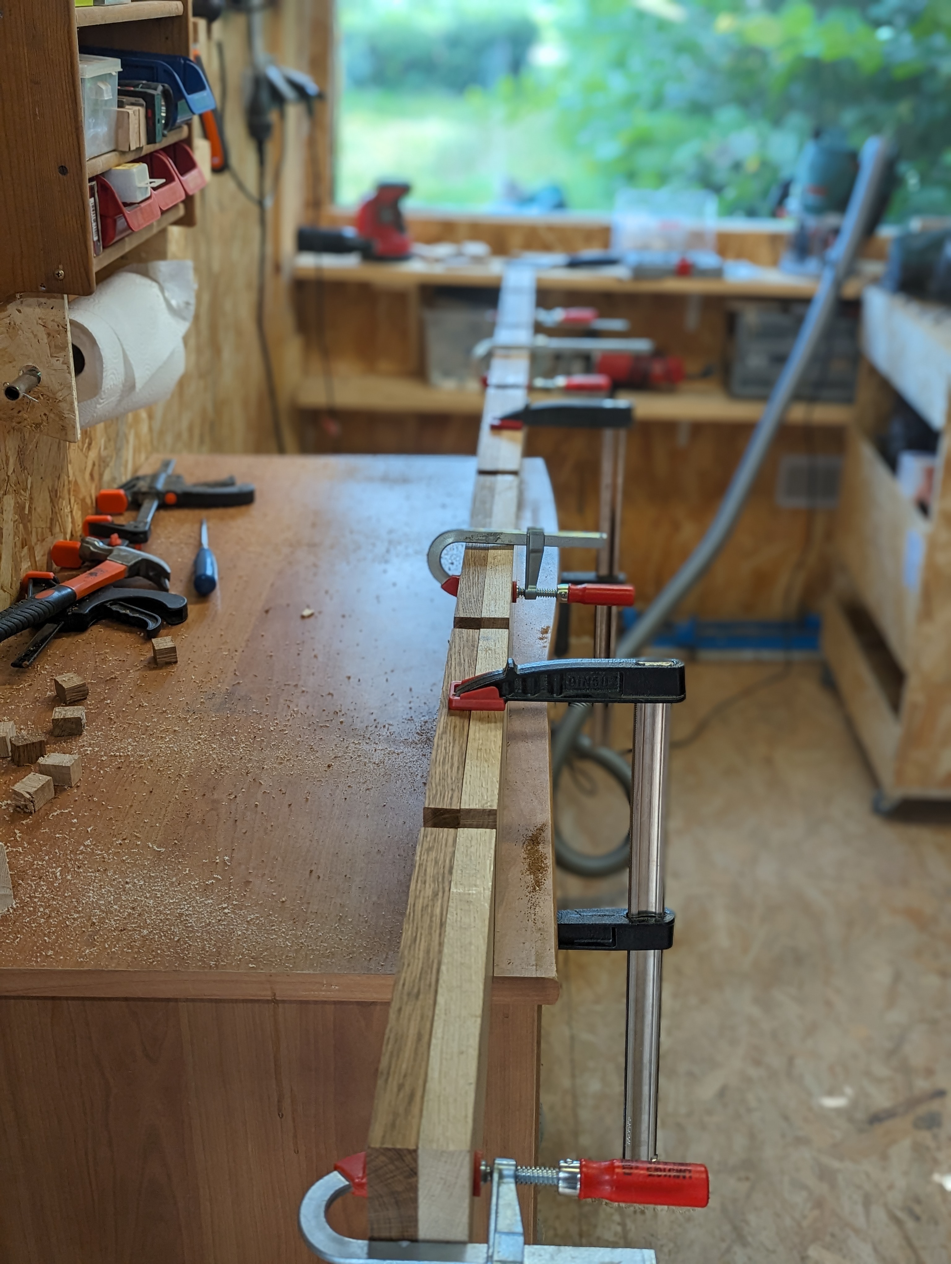 I cut the wood to almost the right dimensions and glued the shelves. I had to use a jointer plane to make the shelves perfectly flat and a lot of clamps to glue them together.