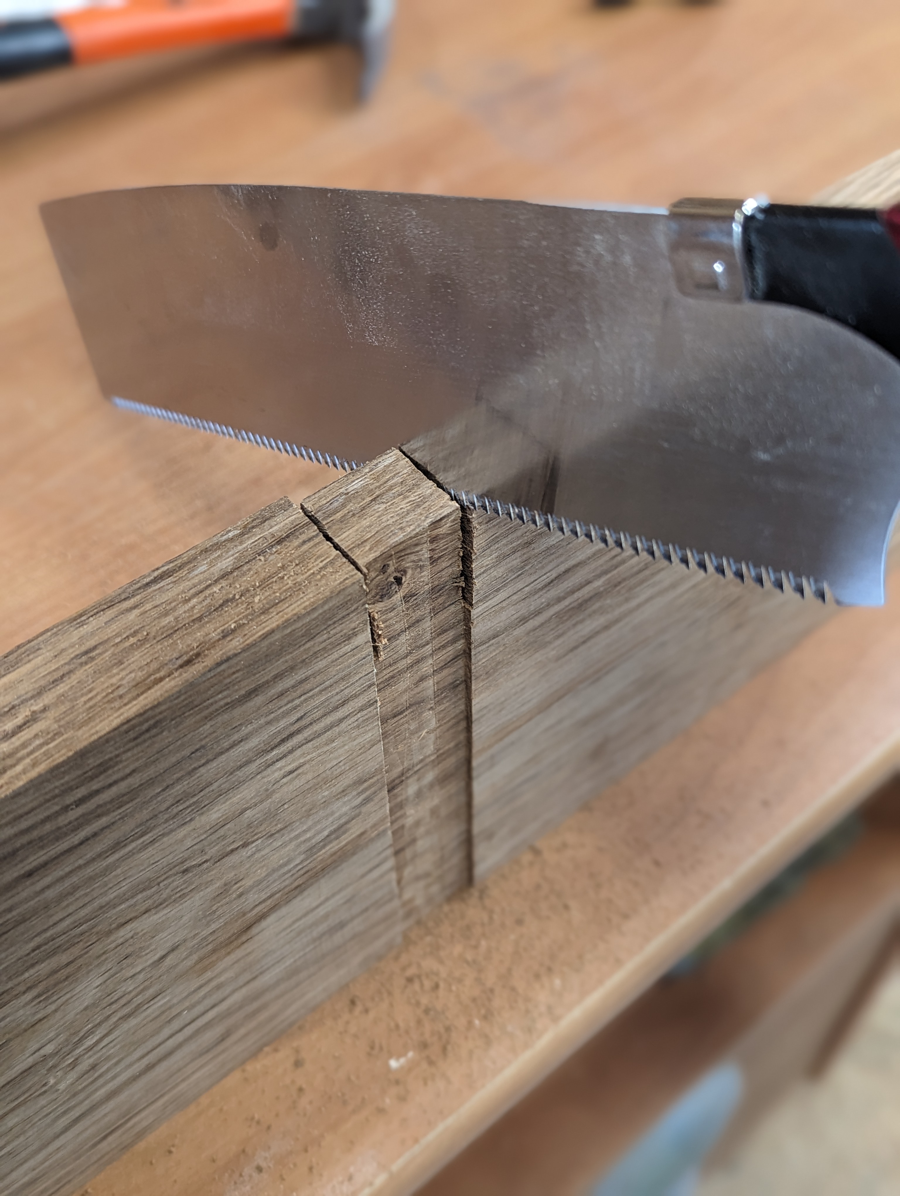 I marked the long board and cut it with a japonese saw. Process was quite long. I had to cut 12 dovetails. I used a chisel to remove the wood between the dovetails. I had to be very careful not to make any mistake. I had to cut the dovetails in the right direction. It's work needing to be very precise with a lot of patient. One milimeter of mistake and the dovetails won't fit together.