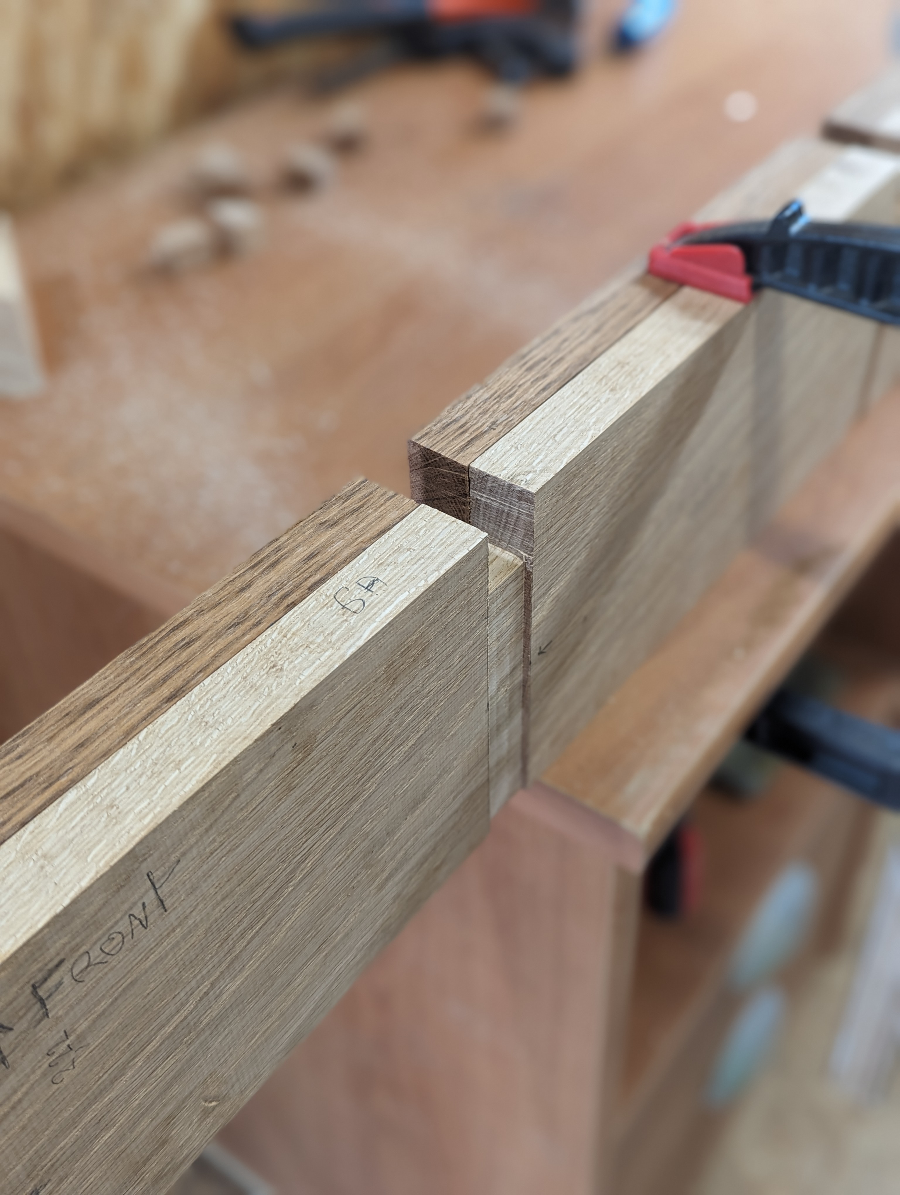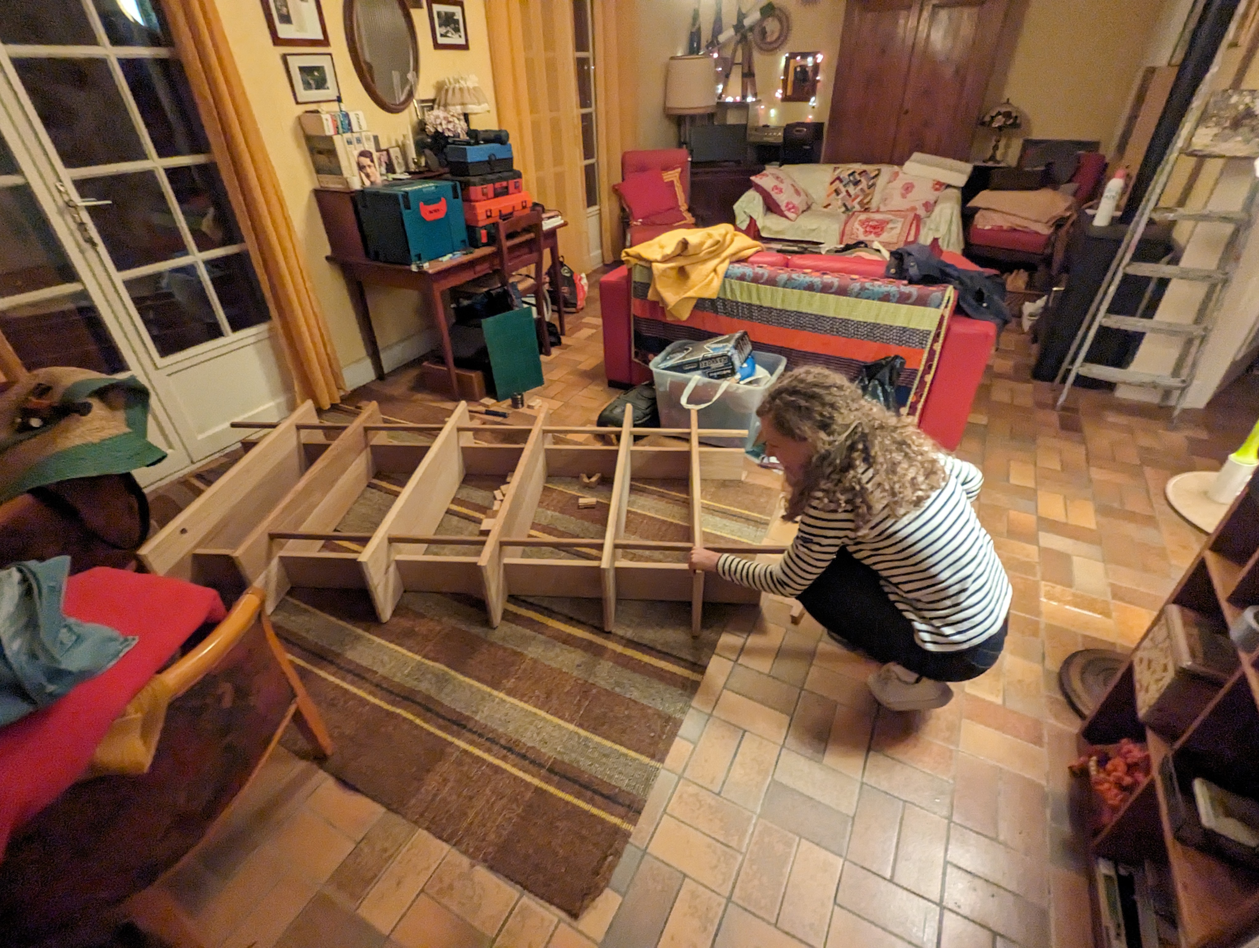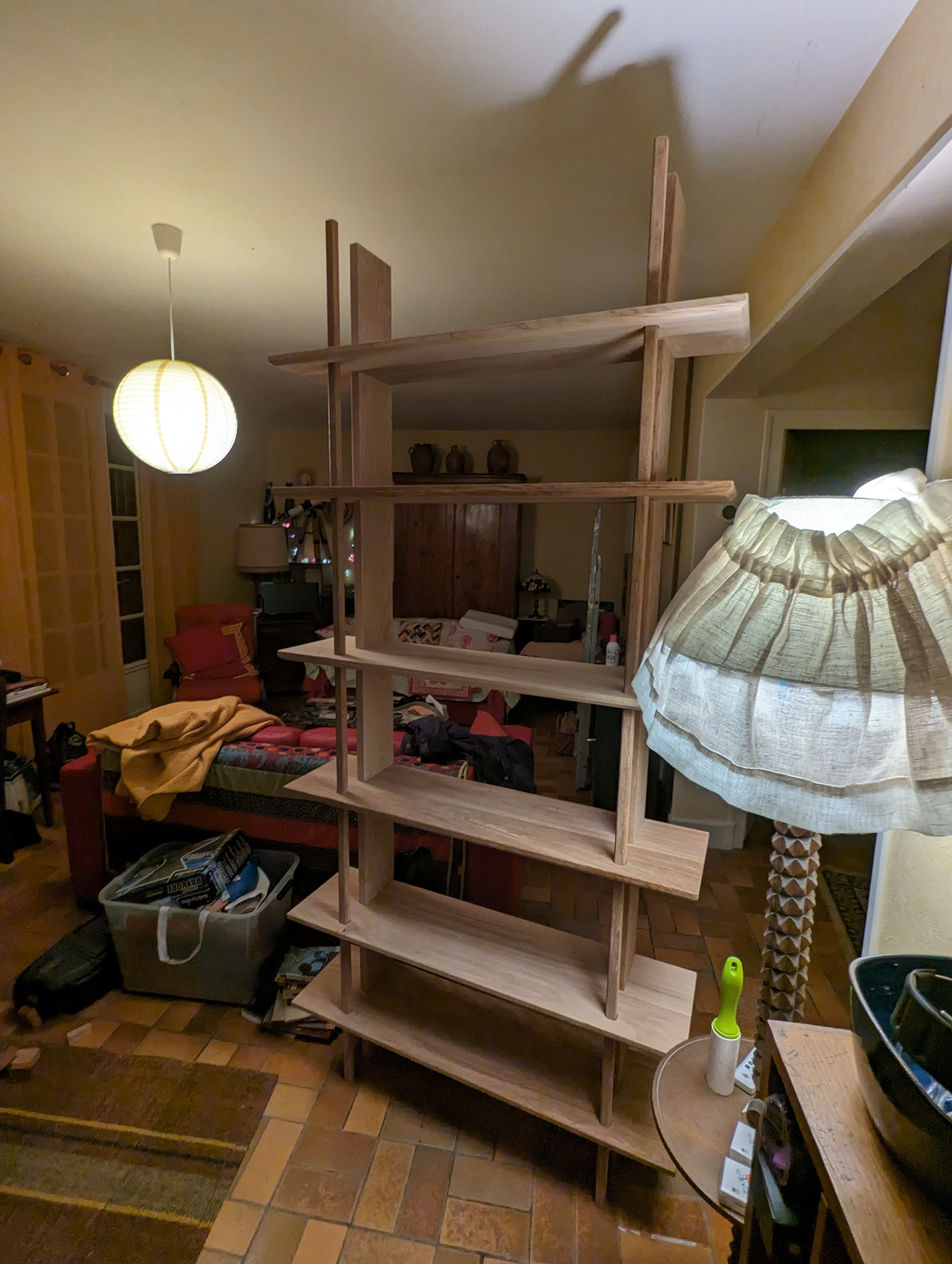 Nevermind the mess ! I assembled the library and put it in place. I had to use a mallet to make the dovetails fit together. My other half was very skeptical about the strength of the library without nails, glue or screw. She did the first assembly. WE used a lot of patience to make it perfect.