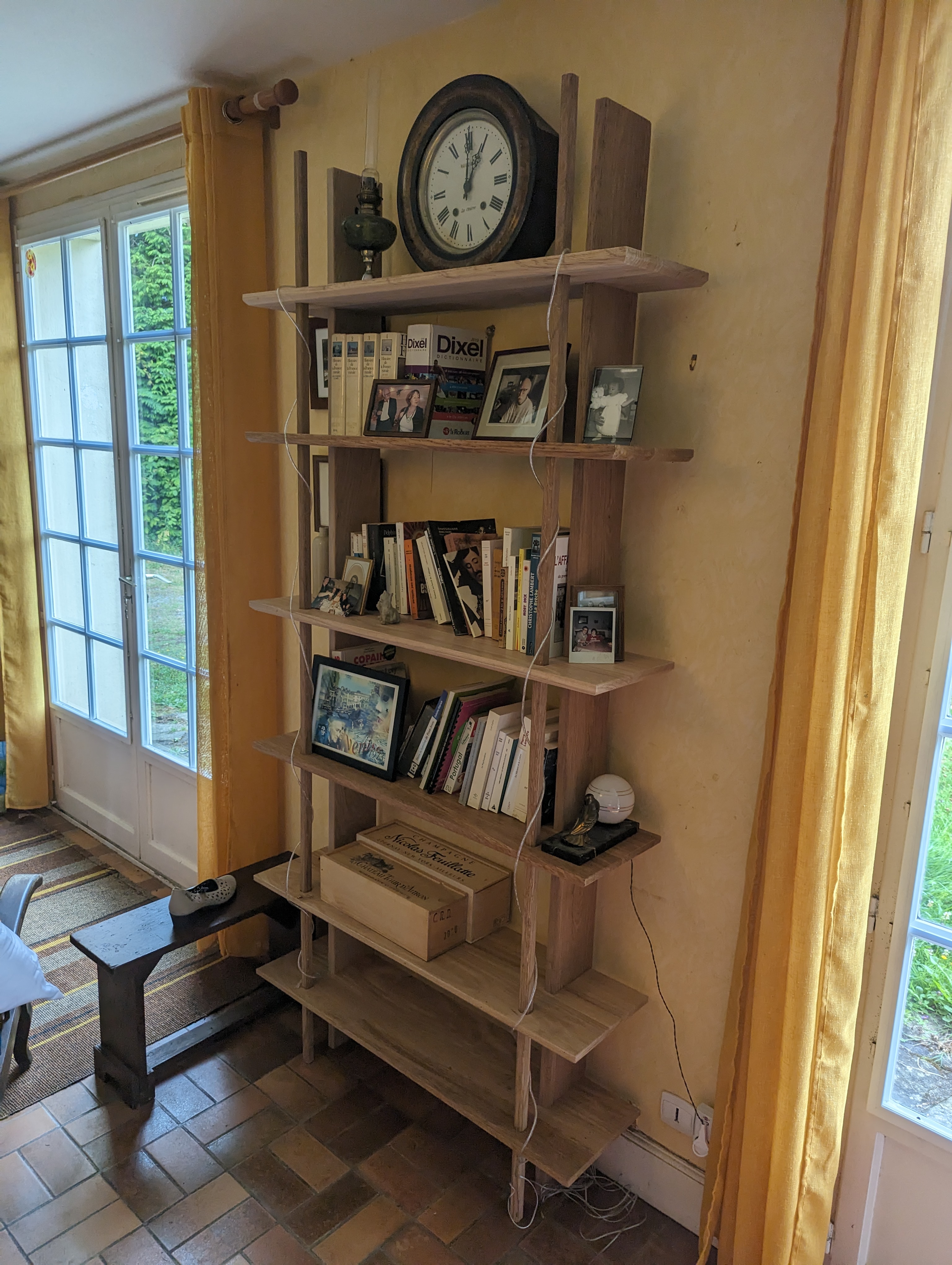 This bookshelf is made of oak. It was built in 2023 during the summer after the bootcamp. It takes me 7 days full-time to build it. 2 meters high, 1.15 meter wide and 26 centimeters deep, it has 6 shelves. No screws, no glue, only dovetails. it was quite a challenge to build it. No mistakes were allowed.